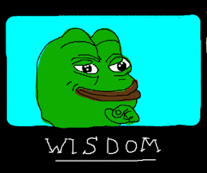 alt Meme strip style background with a poorly drawn thinking "pepe the frog" in the center with an underlined caption that reads "WISDOM" in all caps Meme strip style background with a poorly drawn thinking "pepe the frog" in the center with an underlined caption that reads "WISDOM" in all caps
